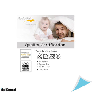 Perna dispune de cusaturi duble de siguranta, este confectionata din bumbac 100%, rezistent, puf si pene de rata. Compania ComfortAce este certificata de ISO-9001, totodata este membru EDFA (Asociatia Europeana pentru Pene si Puf), iar perna este certificata Oeko-Tex 100 Health Textiles. Are o greutate de doar 920g, este complet lavabila la o temperatura de pana la 60 de grade si este antialergica si anti-acarieni. Penele sunt un produs natural si pot avea initial un miros usor, care dispare repede, odata cu utilizarea.