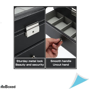 Aceasta cutie pentru ceasuri de la Axroad Mall este solutia ideala pentru pastrarea si organizarea colectiei tale de ceasuri si bijuterii, combinand functionalitatea cu un design modern si elegant. Confectionata din piele ecologica de inalta calitate, MDF si sticla transparenta, cutia ofera protectie eficienta impotriva prafului, umezelii si zgarieturilor.