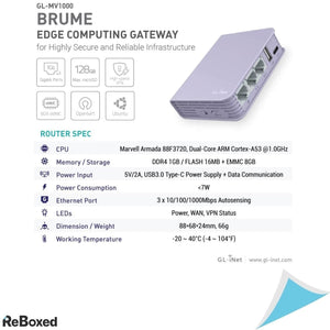 Conceput pentru proiecte IoT avansate si retele de inalta performanta, GL.iNet GL-MV1000 (Brume) este un gateway de tip edge computing cu procesor puternic si suport pentru VPN de mare viteza. Acesta vine preinstalat cu OpenWrt/LEDE, este compatibil cu Ubuntu, si include multiple optiuni de stocare extinsa, ideal pentru utilizatorii care doresc control complet asupra retelei si securitatii datelor.