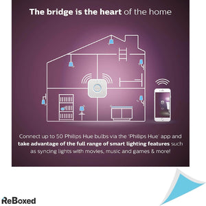 Kit de Start Philips Hue ce consta in 3 x Becuri inteligente LED RGBW E27, 2 x Butoane Hue si Bridge-ul Hue | ReBoxed