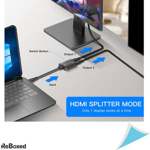 Comutator HDMI : poate fi utilizat în două moduri diferite: conectați 2 surse de intrare cu 1 afișaj de ieșire sau conectați 1 sursă de intrare la 2 afișaje (doar o iesire funcționează la un moment dat si nu amandoua). Cablul HDMI fix, are o lungime de 60cm.