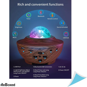Telecomandă și funcție de cronometru. Puteți schimba cu ușurință modurile de proiectie, pentru a vă personaliza stilul, cu telecomanda IR (raza de acțiune: 12 metri). Schimbați culoarea, viteza si luminozitatea, reglați modul muzică, volumul, detectorul interactiv de sunet, setați temporizatorul la 1 sau 2 ore sau redați continuu, fără întrerupere.