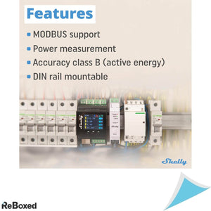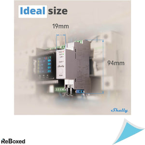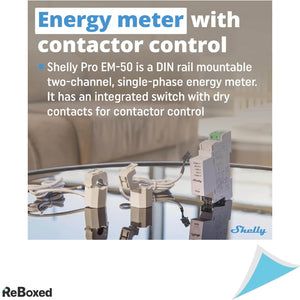 Shelly Pro EM-50 este un contor de energie monofazat, cu doua canale, montat pe sina DIN. Are un comutator integrat cu contacte uscate pentru controlul contactorului.