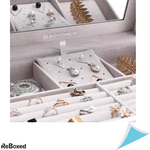 Datorită diferitelor compartimente avand înălțimi diferite, brățările, cerceii, colierele, inelele, ceasurile și chiar si ochelarii de soare, vor fi toate la locul lor, în această cutie de bijuterii și gata să vă servească.