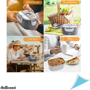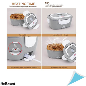 Fie ca esti la birou, in masina sau chiar in concediu, aceasta caserola dispune de alimentare duala : 12V / 24V sau 220V, gratie celor doua cabluri de alimentare, geanta de transport, tacamuri si o cutie de fructe. Recipientul in care se incalzeste mancarea este din otel inoxidabil alimentar 304, usor de detasat si de intretinut. Puterea de incalzire este de 50W iar capacitatea recipientului este de 1.5 litri. In functie de temperatura dorita, precum si de natura continutului, timpul de incalzire este intre 20 si 60 minute.
