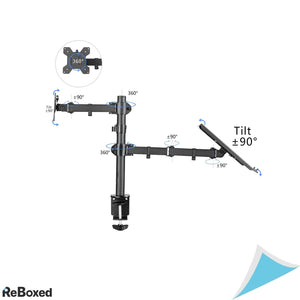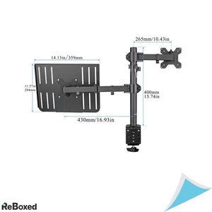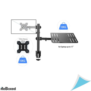 Suport pentru laptop de (maxim 17") si pentru monitor, cu diagonale intre 13" si 27", care care suporta o greutate de pana la 10 kg (pentru fiecare brat), iar cele doua brate se pot regla pe o distanta (inaltime) de 40 cm.