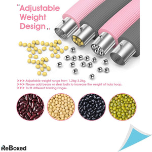 Greutatea reglabila face din hula-hoop un accesoriu ideal pentru incepatori sau profesionisti. Diametrul interior al hula hoop este de 88cm, avand o greutate reglabila. Puteti creste greutatea de la 1.2 cu pana la 3.2 kg adaugand fasole sau bile de otel. Accesoriu potrivit pentru diferite persoane cu diferite nivele de pregatire.