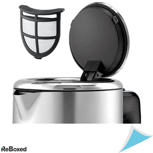 Ceainicul WMF LONO din oțel inoxidabil, de la marca germană WMF, este ideal pentru prepararea rapidă a unor cantități mari de apă caldă. Este fabricat din oțel inoxidabil Cromargan® de înaltă calitate. Designul purist al ceainicului LONO este ideal pentru bucătăriile moderne. Detaliile practice, cum ar fi mânerul ergonomic, deschiderea ușoară a capacului cu o singură mână, elementul de încălzire ascuns sau indicatorul practic de volum extern, sunt plăcute. Datorită puterii sale ridicate de 2400W, ceainicul încălzește apa foarte repede.