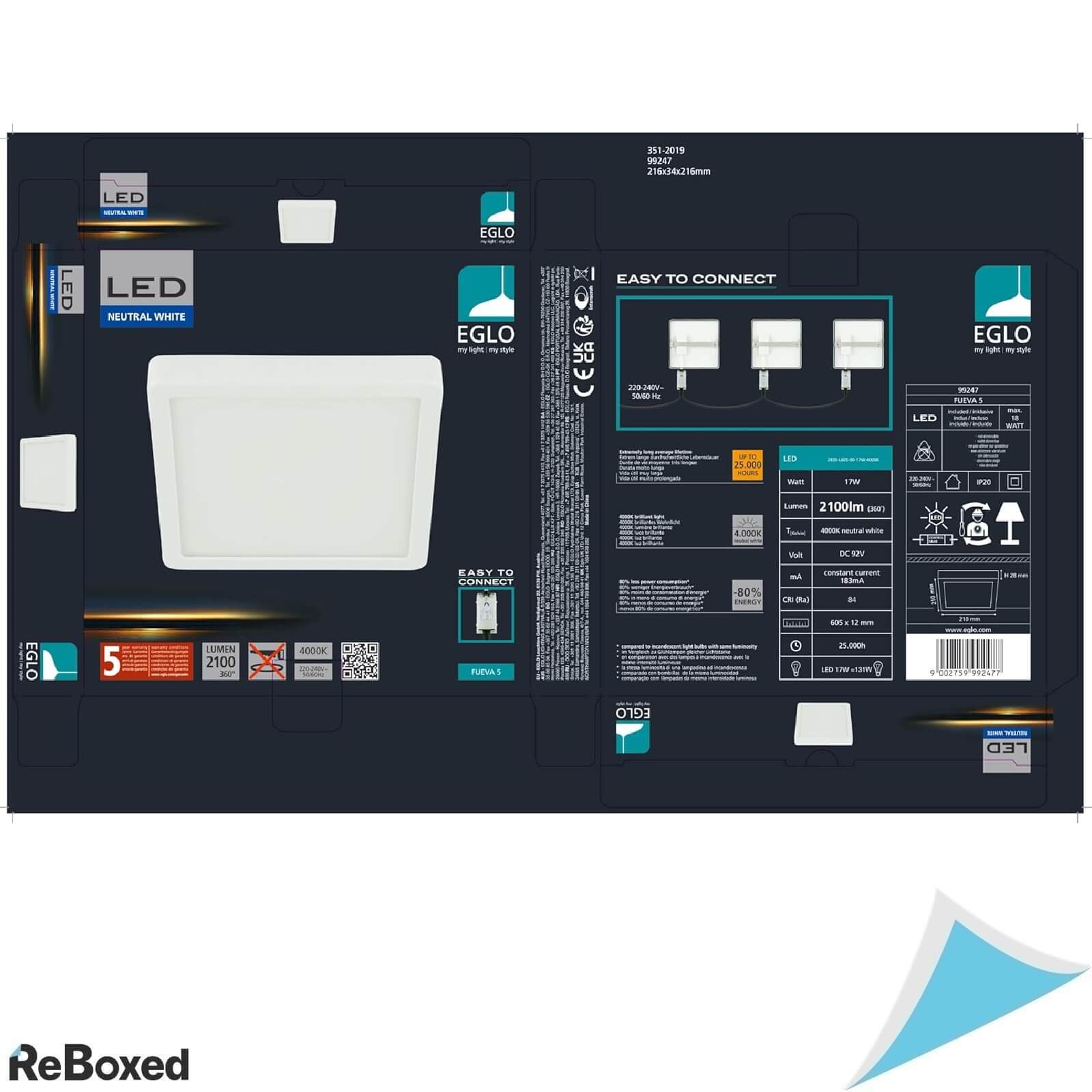 EGLO Fueva 5 este o plafoniera LED compacta, moderna si eficienta, conceputa pentru a oferi o iluminare uniforma si fiabila in orice incapere. Cu dimensiunile de 21 x 21 cm si un design minimalist alb, acest corp de iluminat se potriveste perfect in holuri, bai, bucatarii, dormitoare sau spatii comerciale.