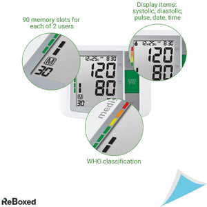 Poate fi folosit de 2 utilizatori iar functia de memorare automata permite salvarea de pana la 90 de valori ale tensiunii si va ofera siguranta unei bune evaluari atunci cand va prezentati la medicul dumneavoastra. Masuratorile sunt clasificate in functie de sistemul de evaluare al OMS, utilizand o scala de culori. Sunt afisate urmatoarele tensiuni: sistolica, diasistolica, data, ora. Calculeaza valoarea medie a datelor stocate. Este un dispozitiv medical certificat (certificare in conformitate cu Directiva Dispozitivelor Medicale MDD). Indicator de aritmie.