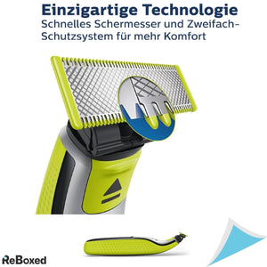 Philips OneBlade are o tehnologie revolutionara conceputa pentru stilizarea parului facial si ingrijire corporala. Poate sa tunda, sa contureze si sa barbiereasca orice lungime de par. Sistemul sau dublu de protectie – un strat de alunecare combinat cu varfuri rotunjite – asigura un barbierit mai usor si mai confortabil. Tehnologia sa de barbierire include un dispozitiv de taiere cu miscari rapide (200 pe secunda), astfel incat este eficienta chiar si pe firele mai lungi.