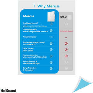 Meross Connected Roller Shutter Switch este un intrerupator inteligent pentru controlul rulourilor, jaluzelelor, draperiilor electrice sau a altor sisteme motorizate de umbrire. Conceput pentru integrare completa in ecosistemele smart home, acesta este compatibil cu Apple HomeKit, Amazon Alexa si Google Home, permitand control vocal intuitiv si acces rapid de la distanta prin smartphone.