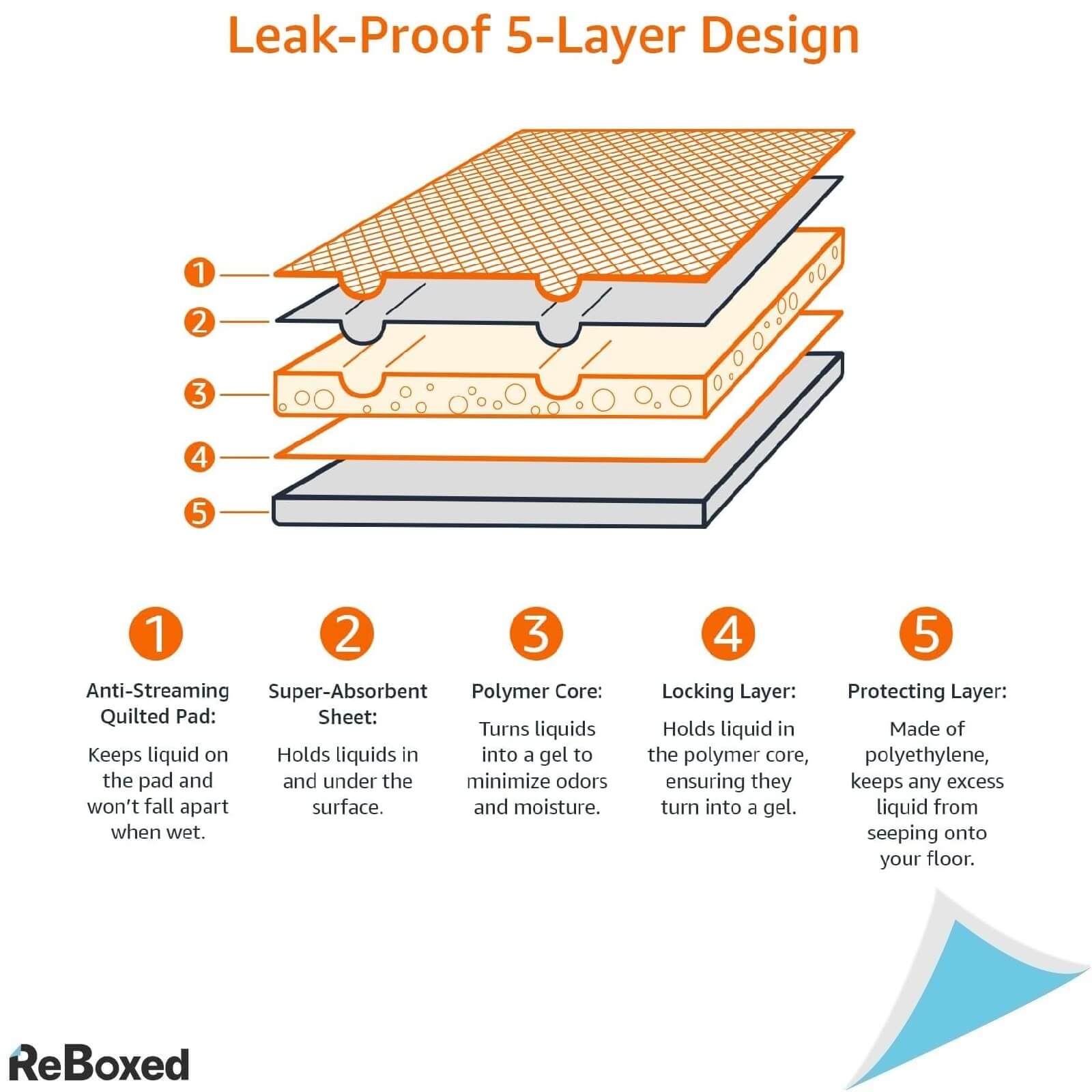 Amazon Basics Dog and Puppy Training Pads sunt pad-uri absorbante de inalta calitate, concepute pentru dresajul catelusilor, pentru cainii adulti sau seniori si pentru situatiile in care iesirea afara nu este posibila. Datorita constructiei avansate in 5 straturi si a miezului super absorbant, lichidele sunt transformate rapid in gel la contact, mentinand suprafata uscata si podelele protejate.