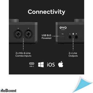 EVO 4 se conecteaza prin USB-C, fiind compatibila cu PC, Mac si dispozitive iOS, oferind o experienta plug-and-play rapida pentru inregistrare si productie muzicala.
