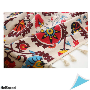 Designul exclusiv foloseste rosu, galben si albastru ca si culori tematice, completate de frunze negre si flori boho. Elemente detaliate precum ramuri si frunze de artar adauga profunzime si naturalete.