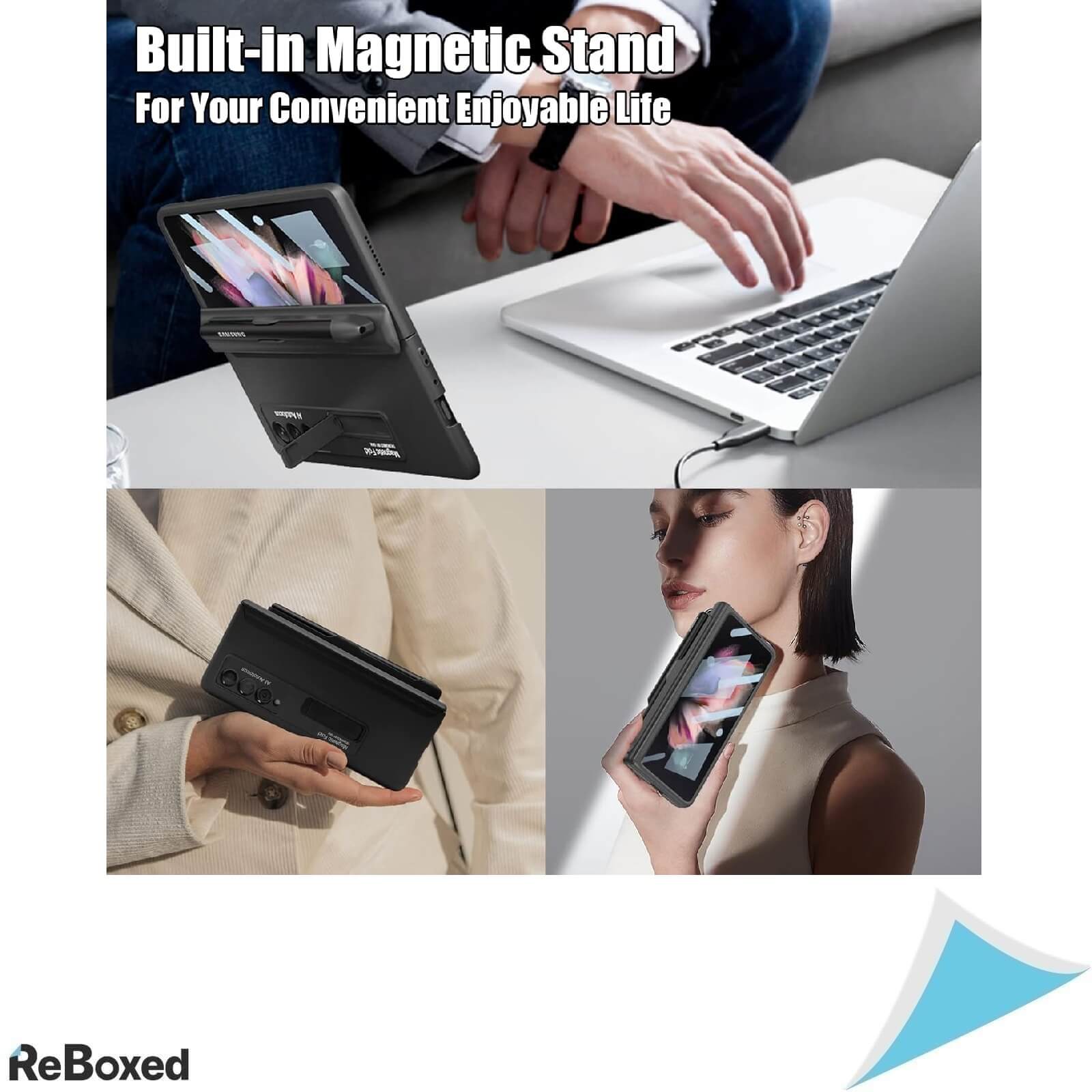 Husa premium pentru Samsung Galaxy Z Fold 3, cu suport pentru S Pen, protectie pentru balama si ecran de sticla securizata inclus. Design magnetic si suport incorporat pentru o experienta moderna, sigura si multifunctionala. (S Pen nu este inclus)