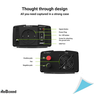 Perfect pentru alimentarea laptopurilor, televizoarelor, pompelor de caldura sau altor echipamente sensibile, invertorul ofera o putere constanta de 300W si varfuri de pana la 600W. Include priza auto (bricheta), cabluri cu siguranta si port USB pentru incarcarea dispozitivelor mici.