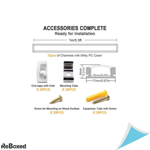 Setul de la ReBoxed, consta in 10 profile de aluminiu cu lungime de 1 metru, 10 difuzoare de lumina, 20 capace terminale, cleme si suruburi necesare montajului.