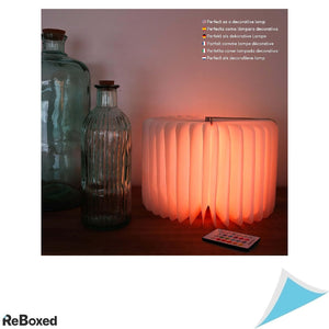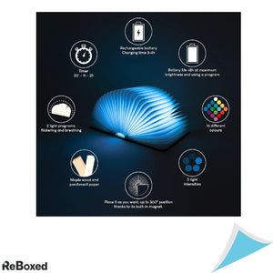 Lampa decorativa in forma de carte, realizata din lemn natural si hartie pergament rezistenta. Se deschide la 360° si are inchidere magnetica. Include telecomanda pentru controlul a 16 culori, 2 moduri dinamice de iluminare (respiratie si clipire), timer de 30 minute, 1 ora sau 2 ore, si reglaj de intensitate in 5 trepte. Functioneaza pe baterie reincarcabila de 2500 mAh, cu autonomie de peste 8 ore si poate fi folosita in timpul incarcarii. Cadou ideal pentru barbati, femei sau adolescenti, potrivit pentru birou, dormitor, living sau terasa.