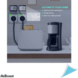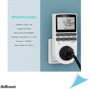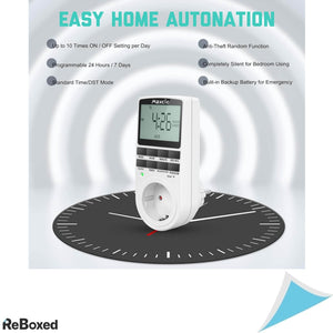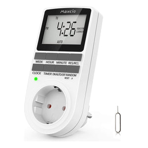 Priza digitala cu temporizator Maxcio iti permite sa automatizezi pornirea si oprirea aparatelor electrice, economisind energie si oferind un plus de confort si siguranta. Poti programa pana la 10 intervale ON/OFF zilnic sau saptamanal, iar functia de mod aleatoriu (random) simuleaza prezenta in casa cand esti plecat. Include baterie interna pentru pastrarea programelor in cazul unei pene de curent.