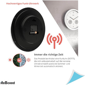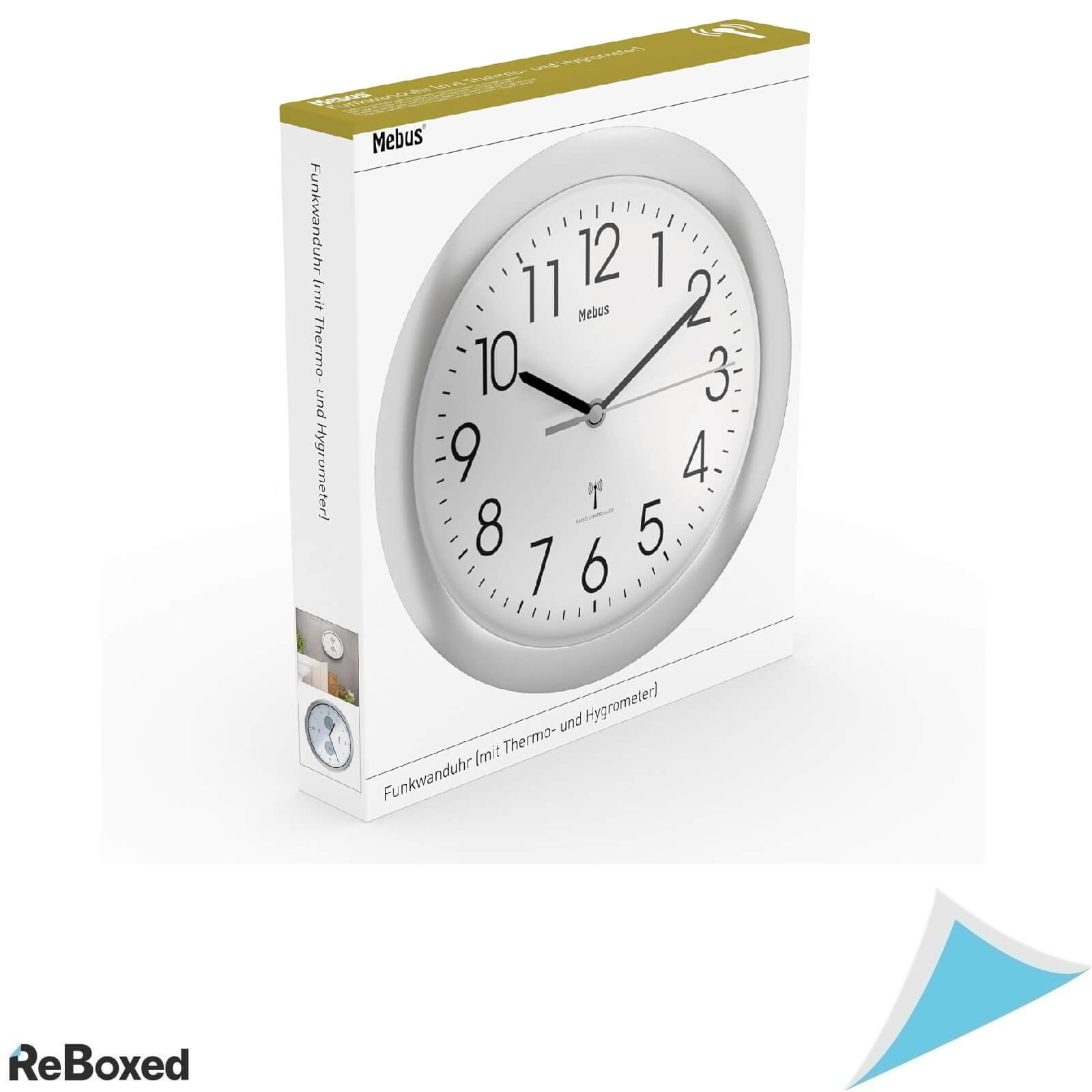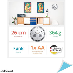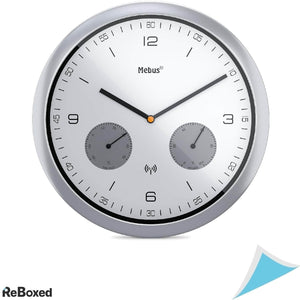 Ceasul de perete Mebus 52827 combina un design modern cu functionalitate practica. Cu carcasa argintie, cadran alb si cifre negre bine conturate, ceasul ofera o citire clara a orei. Este radio controlat, sincronizandu-se automat pentru precizie maxima, si include termometru si higrometru pentru monitorizarea temperaturii si umiditatii camerei.