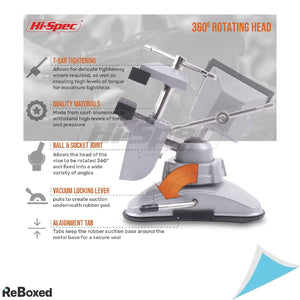 Apollo Mini Vice este un dispozitiv de prindere compact si versatil, ideal pentru lucrari de precizie precum modelism, electronica, bijuterii, hobby-uri si chiar armurierie. Datorita ventuzei de fixare ultra-puternice, menghina se poate atasa cu usurinta pe orice suprafata plana si curata, fara a fi nevoie de o masa de lucru dedicata.