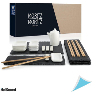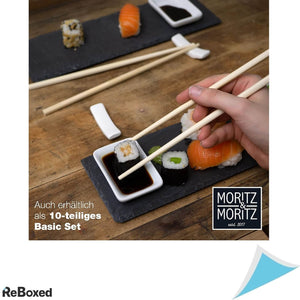 Transforma cinele acasa in experiente autentice japoneze cu setul pentru sushi Moritz & Moritz, 22 piese. Conceput pentru 4 persoane, include tot ce ai nevoie pentru a savura preparatele preferate: farfurii elegante, boluri pentru sos, platou pentru servire si betisoare din bambus. Designul modern si materialele de calitate fac acest set perfect pentru cine in familie sau seri tematice cu prietenii.