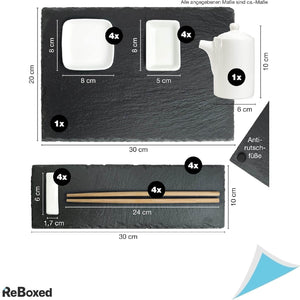 Piese incluse: 4 farfurii, 1 platou servire, 4 boluri pentru sos, 8 betisoare din bambus, 1 suport betisoare, 4 suporturi pentru sos