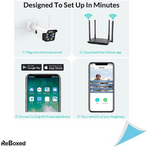Camera înregistrează la rezolutie Full-HD1080p, imagini de înaltă definiție, avand un obiectiv cu unghi larg de 110 grade, Zoom Optic 8x, LED-uri IR, pentru vedere pe timp de noaspte de pana la 20 metri, audio bi-directional, compatibila cu Alexa. Camera are difuzor și microfon încorporat, care vă permite să vorbiți și să ascultați, folosind aplicația.