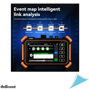 Harta de evenimente si stocare date : cu Noyafa NF-983 se pot vizualiza dintr-o privire problemele si defectiunile din retea. Informații precum lungimea legaturii de fibra optica, tipul de conector, punctul de fuziune sau punctul de rupere, sunt prezentate intr-o forma grafica mai usor de inteles. Salvați si vizualizati curbele de testare, mariti si mutati curbele, vizualizati detalii. Testerul OTDR permite crearea de rapoarte de testare, inclusiv grafice ale traiectoriei curbelor, setari ale parametrilor, informatii despre evenimentele fibrei si informatii despre legatura cu fibra.