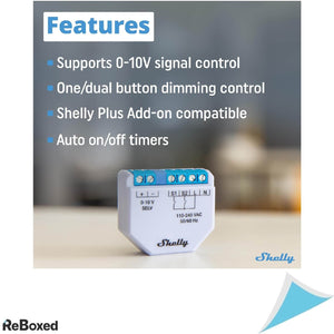 Shelly Plus 0-10V Dimmer este un dimmer smart WiFi conceput pentru controlul precis al luminilor cu iluminare reglabila (0–10V), ideal pentru automatizarea inteligenta a locuintei sau a spatiilor comerciale. Acest dispozitiv permite ajustarea intensitatii luminii direct din aplicatie, prin comenzi vocale sau automatizari predefinite – totul fara a fi necesar un hub.