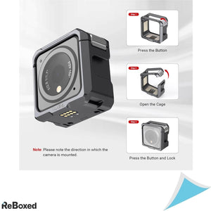 Cage-ul permite fixarea si eliberarea camerei printr-un sistem de blocare prin apasare, fara a bloca ecranul, butoanele, antena sau filtrul. De asemenea, designul include multiple puncte de montare pentru accesorii: un orificiu filetat 1/4"-20 si cold shoe pe ambele parti pentru microfoane, lumini LED sau alte accesorii, doua orificii filetate M4 in partea de jos si un suport de interfata pentru accesorii de actiune.
