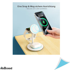 Statia de incarcare wireless 3-in-1 inductiva, de culoare alba, este solutia perfecta pentru utilizatorii Apple care doresc sa incarce simultan iPhone-ul, Apple Watch-ul si AirPods-ul intr-un singur loc, eliminand cablurile incurcate si pastrand biroul organizat.