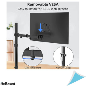 Suport de calitate industriala, ideal pentru un monitor de pana la 31.5" si greutate de pana la 10Kg. Dispune de VESA 75x75mm precum si de 100x100mm. Stalpul central de sustinere este inalt, de 80cm, perfect pentru situatiile in care se lucreaza din picioare.
