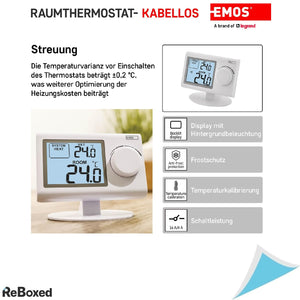 Setul include un transmitator cu senzor de temperatura si display iluminat, precum si un receptor care comunica prin radio pe o distanta de pana la 100 m. Termostatul ofera afisarea temperaturii actuale si a celei setate, cu reglaj in trepte de 0.5°C si o precizie de ±0.2°C.
