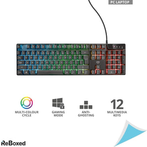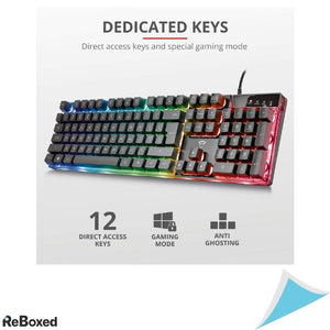 Tastatura gaming Trust GXT 835 Azor cu layout italian QWERTY, conectare USB si iluminare LED RGB in 3 moduri. Ideala pentru gaming, are functii anti-ghosting, mod joc si 12 taste multimedia. Design ergonomic cu picioare ajustabile si baza antialunecare, compatibila cu PC, Mac si laptopuri.