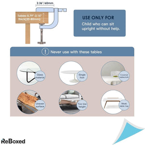 Protectie pentru Siguranta: Scaunul are brate din plastic moale antiderapant pentru a proteja mesele de zgarieturi. Piesele modulare precise si patentate asigura ca scaunul poate fi strans usor si fixat ferm pe masa.