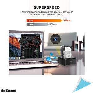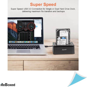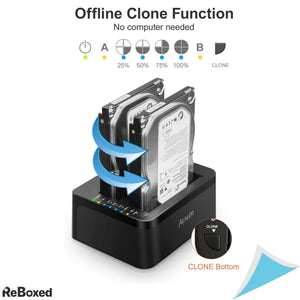 Alxum Docking Station USB la SATA, permite instalarea a doua HDD/SSD SATA 1/2/3, suportand capacitati de pana la 2 x 18TB.