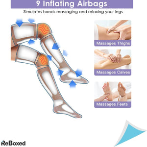 Masajul coapselor, gambelor și picioarelor : aparatul de masaj masajul cu compresie de aer pentru picioare, are 3 x 3 airbag-uri mari în interior, poate masa de la talpile picioarelor si până la coapse, pentru a elimina oboseala și pentru a îmbunătăți circulația sângelui. Este foarte potrivit pentru persoanele care stau mult timp în picioare, sportivi, vârstnici.