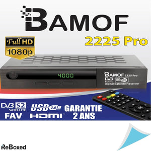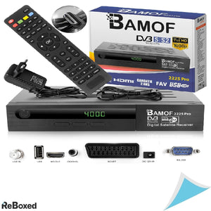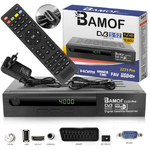 Bamof 2225 PRO este un receptor digital de satelit cu functii avansate si imagine Full HD 1080p. Este preprogramat pentru satelitii Astra, Hotbird si Türksat, astfel ca poate fi utilizat imediat, fara configurari suplimentare. Include telecomanda eficienta si cablu HDMI.