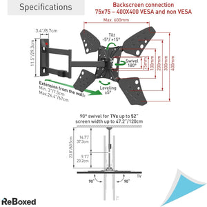 Potrivit pentru televizoare/display-uri cu diagonala de pana la 80" si avand o greutate proprie de pana la 50Kg. Suportul a fost testat cu greutate de 3 ori mai mare decat cea declarata. Este FULL-MOTION : il puteti roti, plia, pivota si inclina.