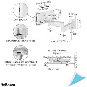 Suportul permite o rotatie a tabletei la 360° si trei pivoti care : se rotesc in apropierea peretelui la 180° ori 360°, se rotesc in apropierea clemei tabletei la 360°, in plus are inclinare de la -20° la 90°.