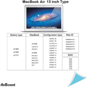 Compatibilitate cu MacBook Air 13" tip: MacBook Air 13" A1466 (2017, începutul lui 2015, începutul lui 2014, mijlocul lui 2013), MacBook Air A1369 (sfârșitul lui 2010, mijlocul lui 2011). Numar EMC : 2469 / 2559 / 2392 / 2632 / 2925 / 3178.