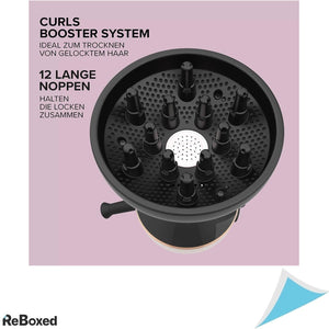 sistemul Curl Booster – directioneaza uniform aerul, usuca delicat parul si mentine buclele definite, cu o suplete naturala