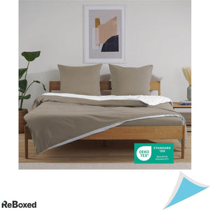 Set-ul contine o lenjerie pentru pat 140x200 cm si o fata de perna 80x80 cm de culoare taupe/alb.