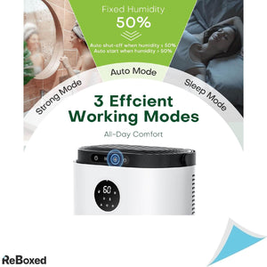 Dezumidificatorul are un mod automat care se poate opri automat atunci cand umiditatea este sub 50% pentru a nu dezumidifica excesiv. De asemenea, puteti seta temporizatorul la 8/12/24/36/48 ore si se va opri cand timpul expira. De asemenea, se opreste automat cand rezervorul este plin, sporind siguranta.