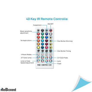 Funcție de control inteligent prin Bluetooth : Această bandă LED, are un receptor Bluetooth îmbunătățit. Controlul prin Bluetooth se face instaland aplicația „LotusLatern” sau folosind telecomanda cu 40 de butoane. Puteți porni și opri banda LED, puteți reduce intensitatea la nivelul dorit sau puteți schimba liber culorile.