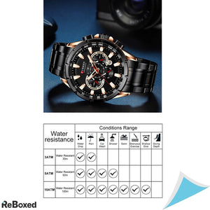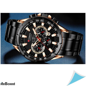 Ceas barbatesc Quartz, curea din oțel inoxidabil, 3 cadrane secundare, rezistenta la apa 3ATM, indicatoare luminiscente, Curren Chronograph, negru/auriu | ReBoxed