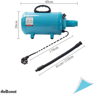 Un uscator de par puternic de 2800W pentru animale de companie, mai ales caini. Dispune de control privind fluxul de aer (cresterea sau scaderea fluxului de aer) precum si diverse duze. Furtunul flexibil poate fi extins cu usurinta pana la 2.5 metri