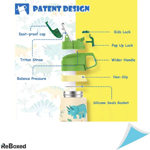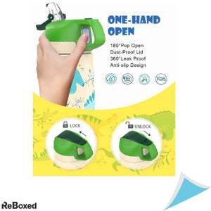 Sticla de apa pentru copii este rezistenta la scurgeri, are un capac de plastic care se inchide prin apasare, este construita din otel inoxidabil alimentar si nu contine BPA. Sticla are picurator pentru utilizare usoara si sistem de blocare ce previne scurgerea. Prin dimensiunile sale este potrivita pentru copii de gradinita sau scoala primara.